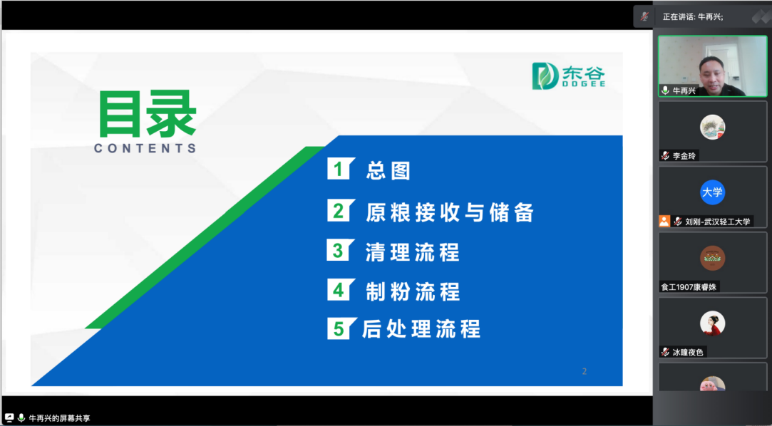 2022年4月24日上午,应beats365粮食工程系邀请,无锡东谷工程科技有限公司副总牛再兴高工通过线上腾讯会议对公司beats365粮食工程专业员工做了面粉厂设计有关关键点的报告。讲座于上午9点准时开始,首先粮工系刘主任向参与讲座的老师和同学们介绍了牛总的专业背景及工作经历,并表达了对牛总热烈欢迎及诚挚谢意。