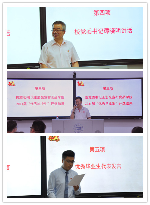 王宏光宣布beats3652021届“优秀毕业研究生”评选名单。他指出,获评的11位同学中,有8位是党员,有3位是入党积极分子,充分体现了研究生党支部的先锋引领作用。他希望研究生继续秉承和弘扬“志存高远,勇夺第一”的食品精神,不负青春,不负韶华,以优异的成绩,为时代交上一份满意的答卷。
