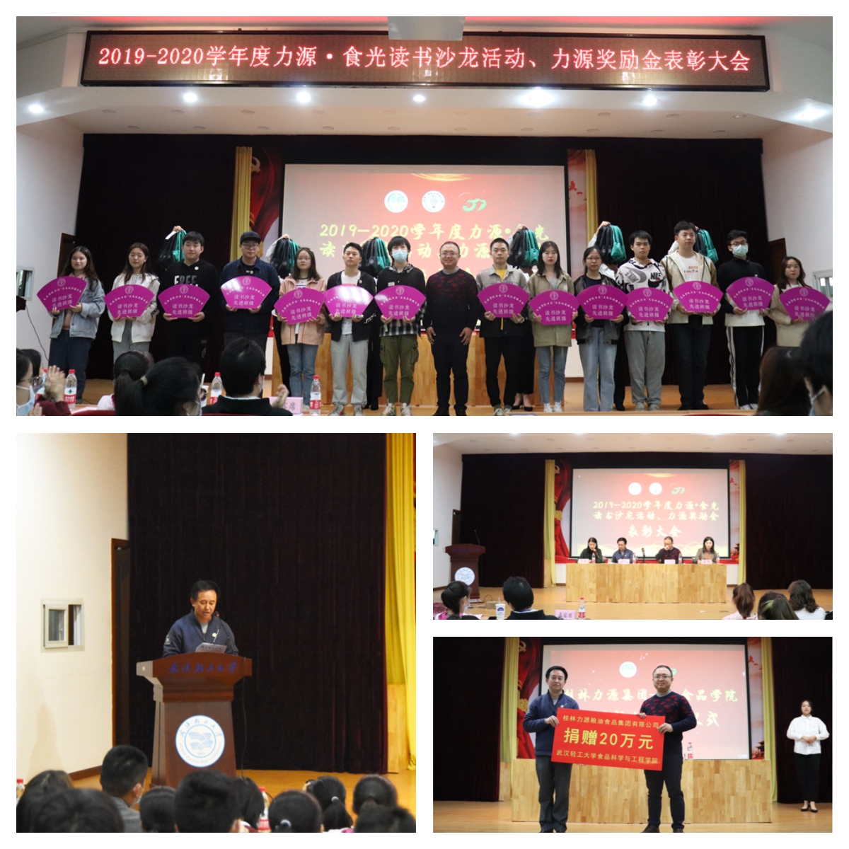 首先,王宏光书记宣读《关于表彰2019-2020学年度beats365力源·食光读书沙龙活动先进集体和个人的决定》和《2019-2020学年度“力源奖励金”的决定》。其次,力源集团董事黄大鹏先生为食工1803等14个“读书沙龙先进班级”、胡雪芹等4位“读书沙龙优秀主讲人”、食工1803等3个“读书沙龙精英班级”颁奖;力源人力资源经理童爽女士为食工1801等6个“读书沙龙优秀班级”、8206等10个“书香小家”寝室颁奖。最后,分团委力源•食光悦读俱乐部会长曹璇同学发表读书感言,她分享了自己加入力源•食光悦读俱乐部后的收获,表达了自己对力源集团和公司老师真挚的感谢。