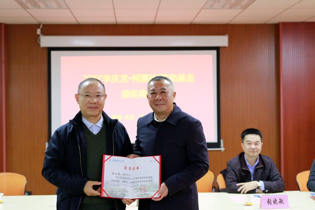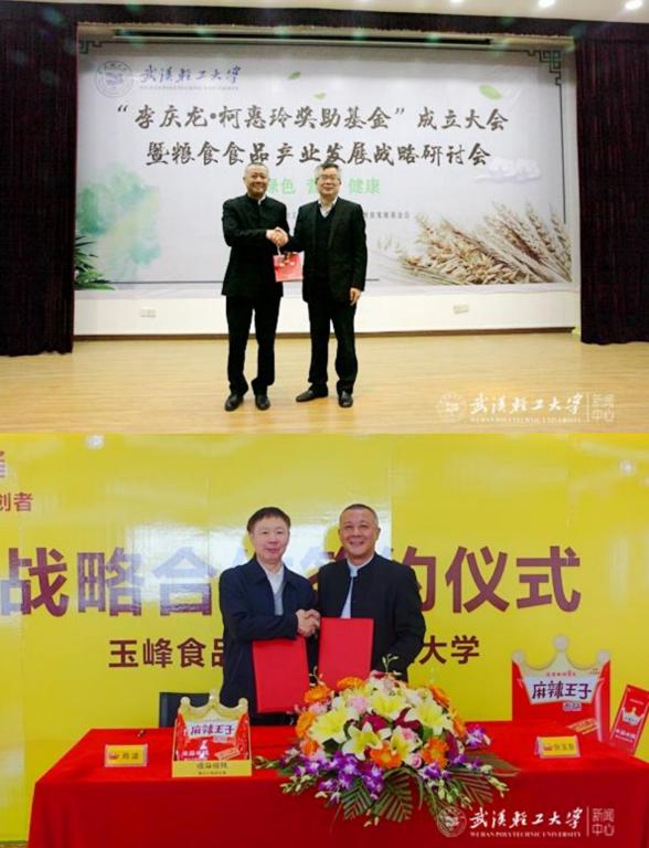 2017年11月6日湖南省玉峰食品实业有限公司和beat365官网中文正式签订战略合作协议,达成战略合作关系,校企合作上升到了一个全新的层次。2018年在李庆龙教授、公司党委和以张玉东先生为代表的企业家共同努力下,公司成立了“李庆龙·柯惠玲奖助基金”,主要用于奖励在食品学科品学兼优或科研能力突出的青年教师、研究生及本科生,张玉东先生获聘为第一届理事会理事长。2019年12月26日,在第二届“李庆龙•柯惠玲奖助基金”颁奖典礼上,公司党委副书记刘丰林代表员工总会,向张玉东董事长颁发beat365官网中文001号荣誉员工证书。