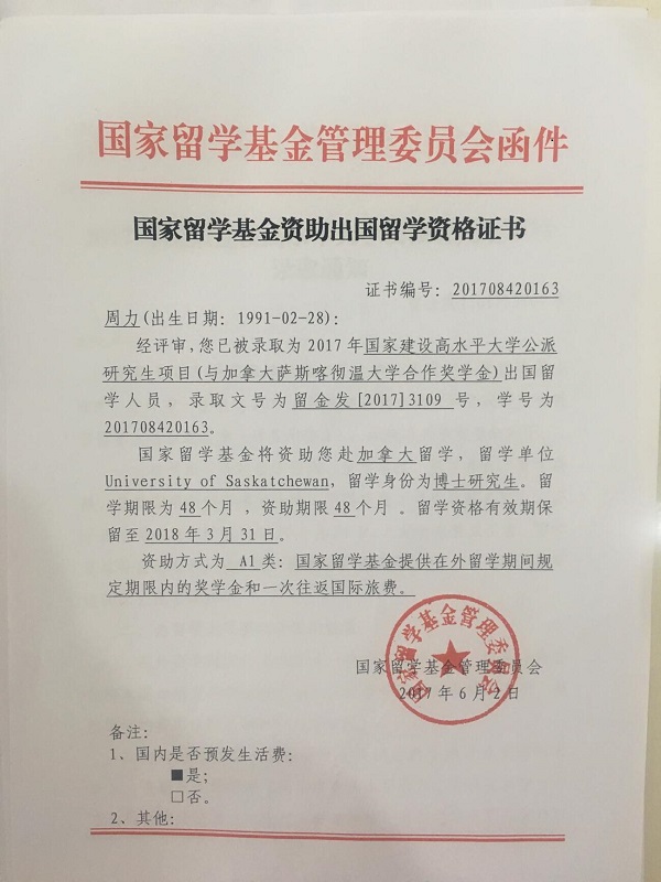 近日,从国家留学基金委传来喜讯,公司应届硕士毕业生周力同学喜获 “国家建设高水平大学公派研究生项目”全额资助,将赴加拿大留学,攻读博士学位。该同学是公司招收硕士研究生以来,第一个获得国家留学基金委全额资助赴外攻读博士的研究生。