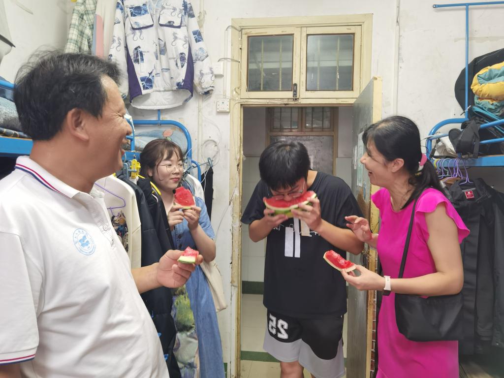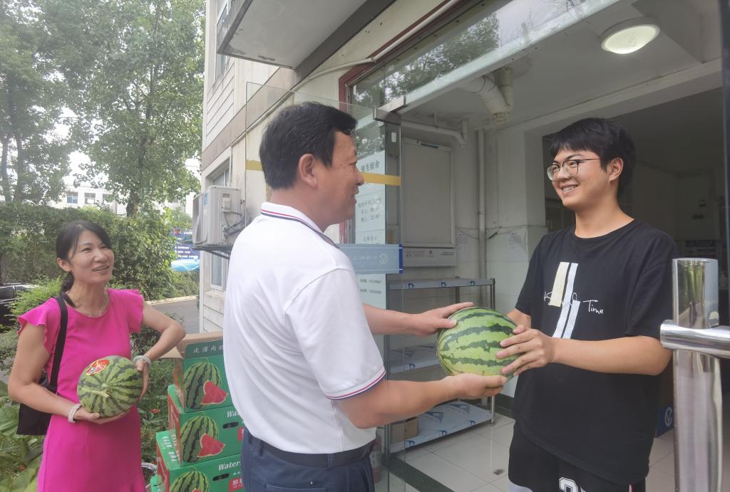 7月24日下午,胡中泽书记一行来到常青绿叶公寓6栋、8栋,为留校学子发放西瓜和凉茶等防暑降温慰问品,在宿舍里和同学们一起吃西瓜,聊学习,谈理想。深入了解留校员工的假期学习规划,详细询问留校员工的生活困难和学习问题。