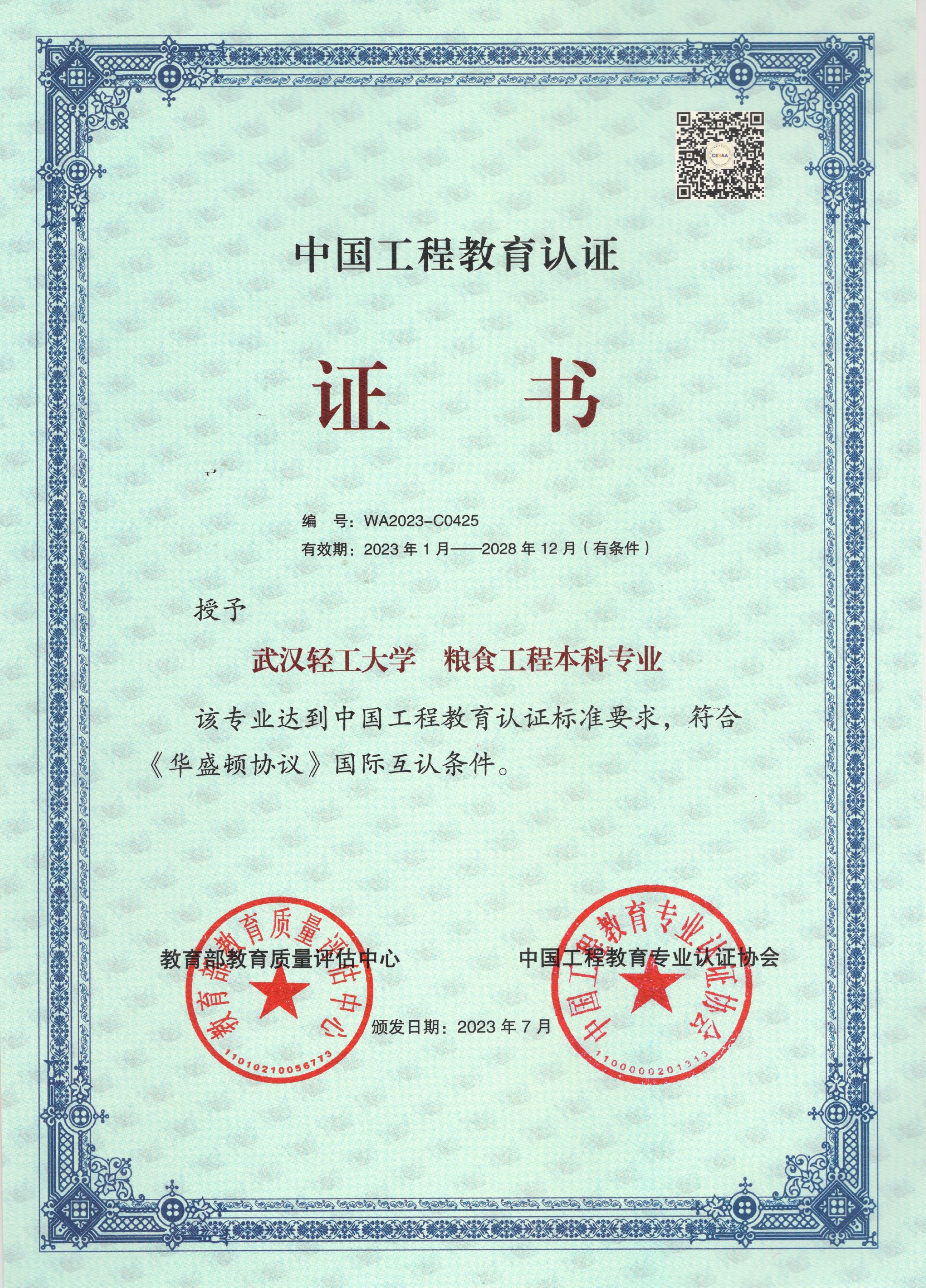 2023年粮食工程本科专业获中国工程教育认证
