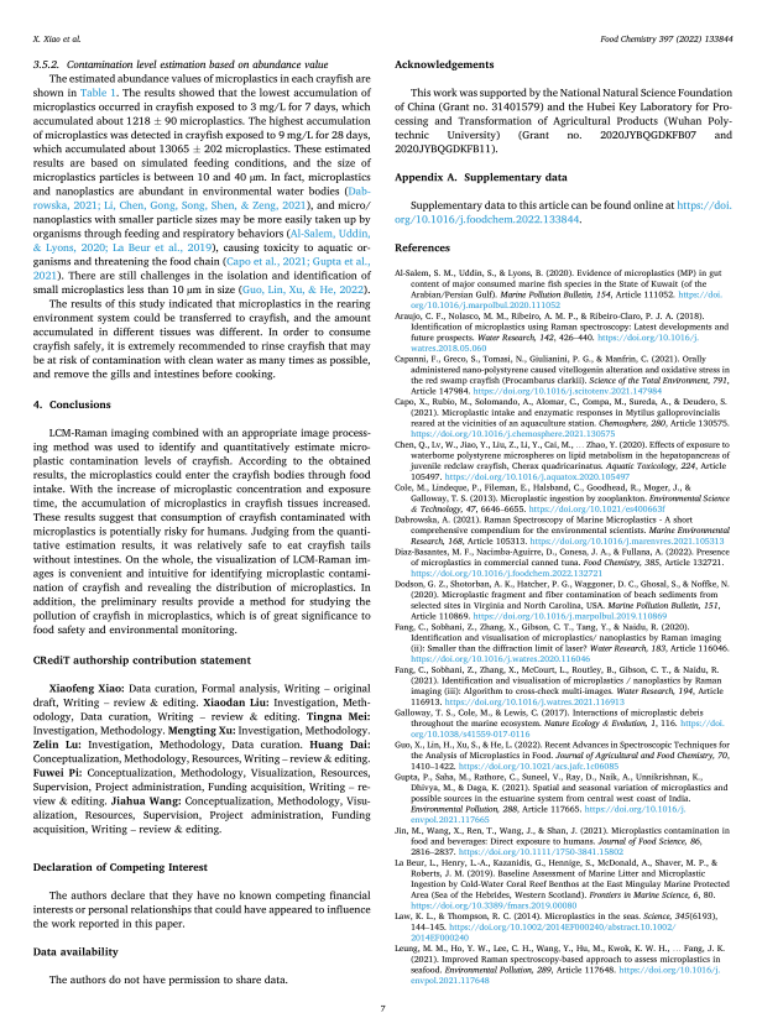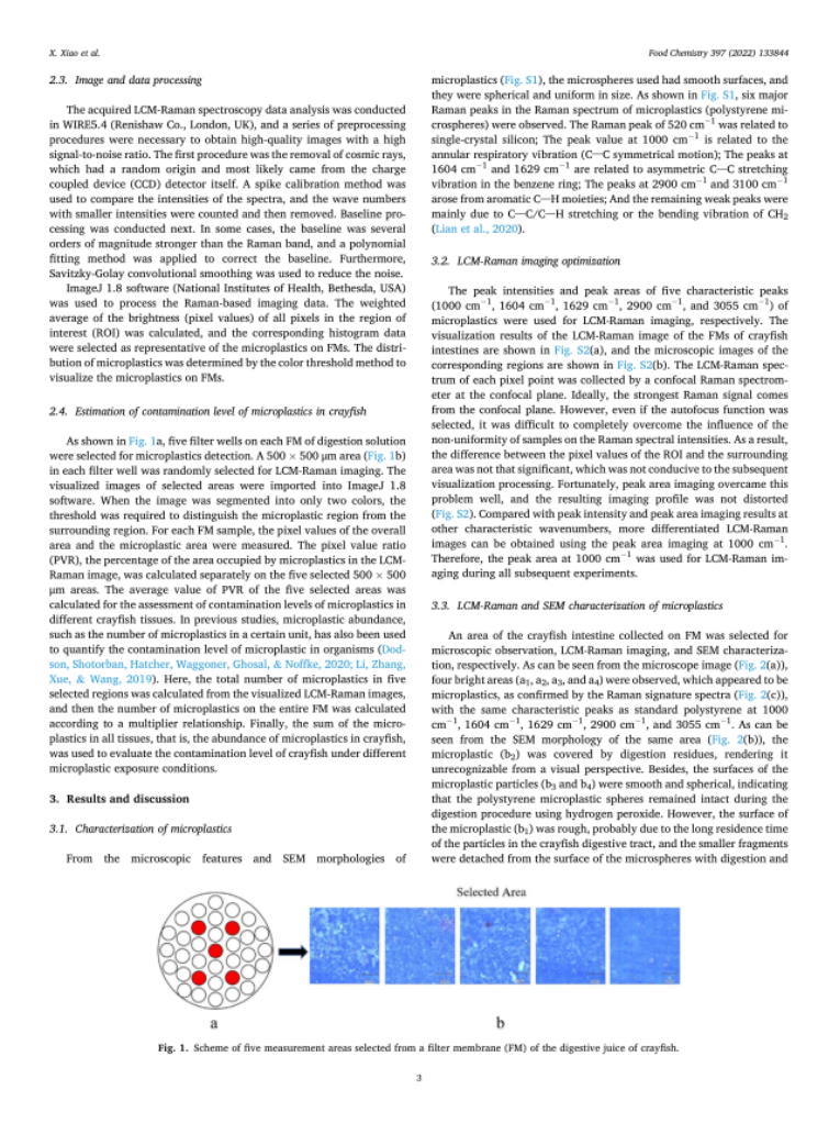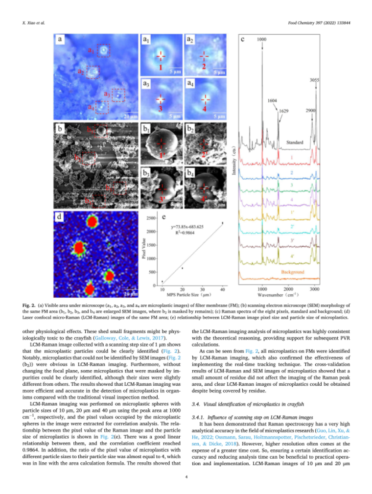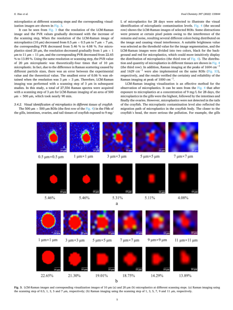 论文报道了使用LCM拉曼成像结合图像处理方法识别和定量估计小龙虾的微塑性污染水平,为微塑料的定性定量提供了检测新策略。