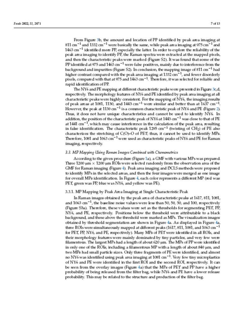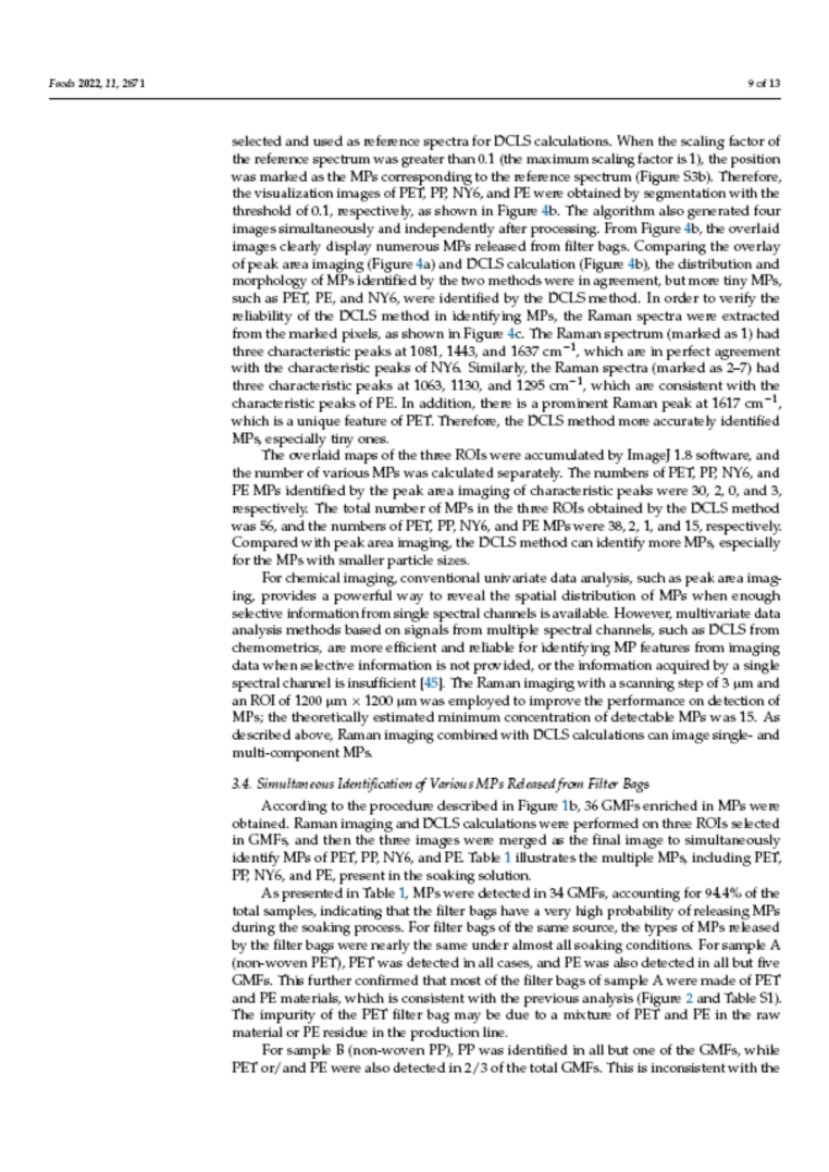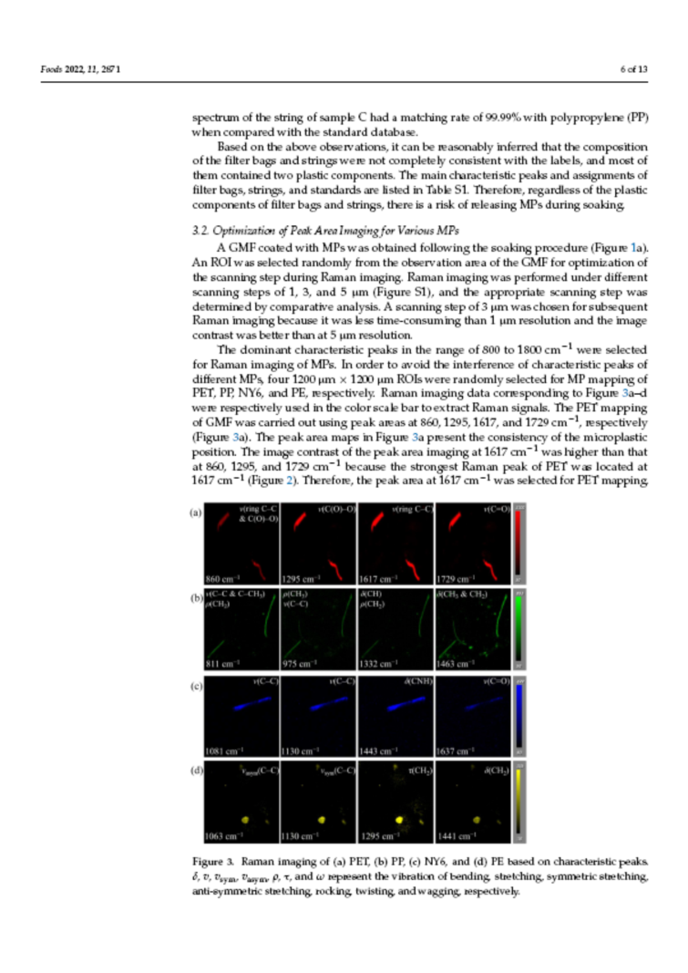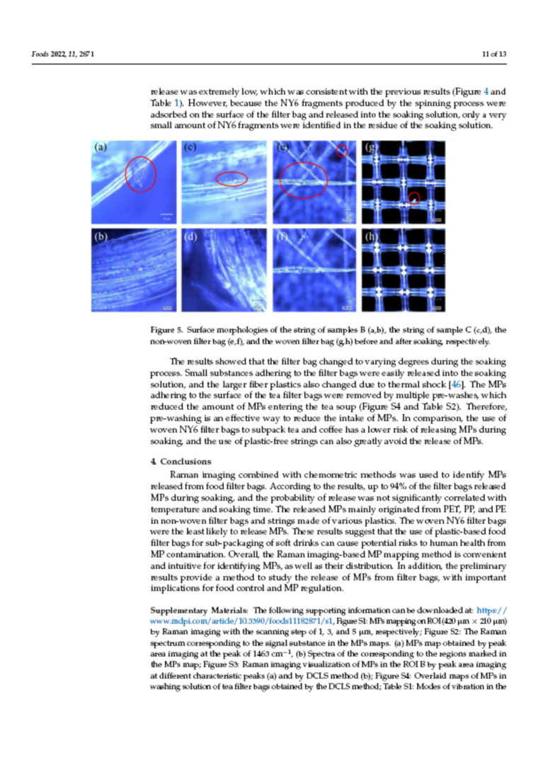 拉曼成像技术的分辨率可以达到1μm,可以检测和识别微塑料的种类,并能通过图像展示微塑料的分布和大小。实验中拉曼成像结合化学计量学方法(直接经典最小二乘)可以较为准确的检测到微塑料。对36个茶叶滤袋的检测结果表明,高达94%的滤袋在浸泡过程中释放MPs,释放的MPs主要来源于PET、PP、PE等无纺布滤袋和各种塑料制成的绳子。这些也表明,使用塑料食品过滤袋对软饮料进行分装时可能会因MP污染而对人类健康造成潜在风险。总体而言,基于拉曼成像的MP映射方法可方便直观地识别MP及其分布。此外,初步结果提供了一种研究MPs从过滤袋中释放的方法,对食品控制和MP监管具有重要意义。