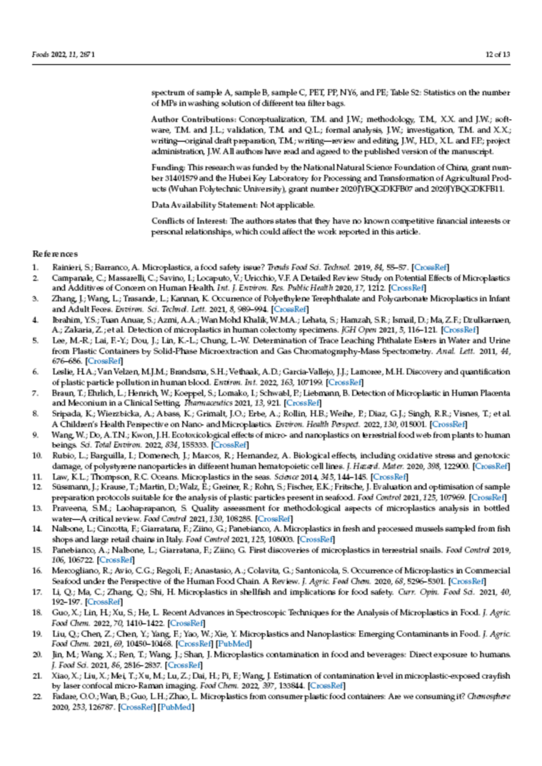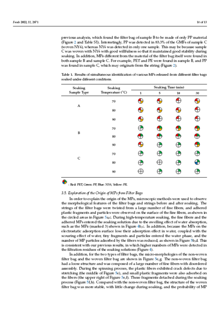 茶叶滤袋(如袋泡茶)被消费者食用之前要经过浸泡,而由于热冲击的作用和滤袋表面在加工过程中所吸附的小碎片,在浸泡过程中微塑料会进入茶汤中。微塑料(尺寸小于5 mm)是环境污染和人类健康的共同问题。由于MPs的尺寸很小,它们在被人类摄入后很容易通过胃肠道。特别是当粒径小于10μm时,MPs可以穿过细胞膜到达循环系统。令人担忧的是,这些微小的MP可以通过胎盘和母乳传播给年幼的婴儿。毒理学研究证实,在肠道、肝脏和肾脏中积累的微纳米塑料会导致哺乳动物出现氧化应激、能量缺乏、脂质紊乱和神经毒性。因此研究食品包装材料尤其是单次使用茶叶过滤袋是有价值的。