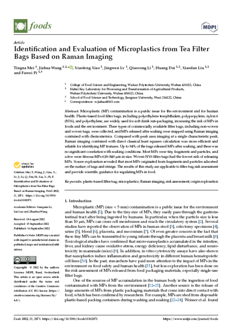 论文报道了拉曼成像结合化学计量学检测茶叶滤袋中微塑料的优势,并探索茶叶滤袋微塑料的来源,为食品中微塑料摄入风险评估和袋泡茶安全消费提供安全建议。