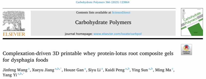 2025年6月9日,beats365易阳教授团队在中科院农林科学一区Top期刊Carbohydrate Polymers(IF:12.5)上在线发表了题为“Complexation-driven 3D printable whey protein-lotus root composite gels for dysphagia foods”的研究型论文。
