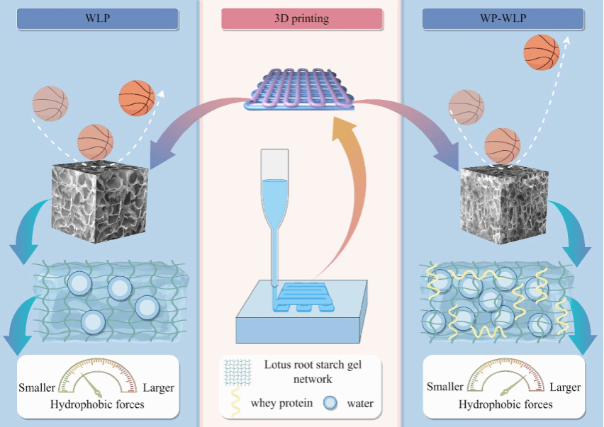 • 乳清蛋白显著提高了莲藕复合凝胶体系的弹性、持水力和3D可打印性。