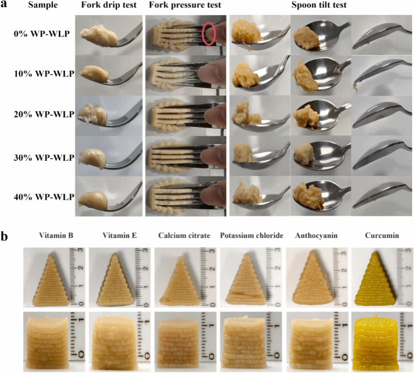 图4.(a)基于不同乳清蛋白添加量的复合凝胶的国际吞咽障碍食物标准化倡议测试和(b)含有不同营养素的3D打印乳清蛋白-莲藕复合凝胶实物图。