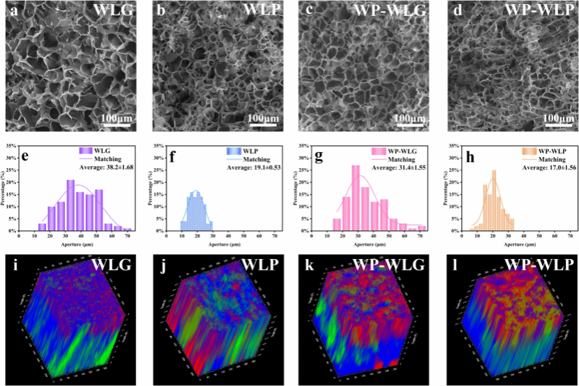 图3.(a~d)不同配方凝胶的微观结构、(e~h)直径统计和(i~l)三维空间形态(蓝色、红色和绿色区域分别代表淀粉、蛋白质和纤维)。