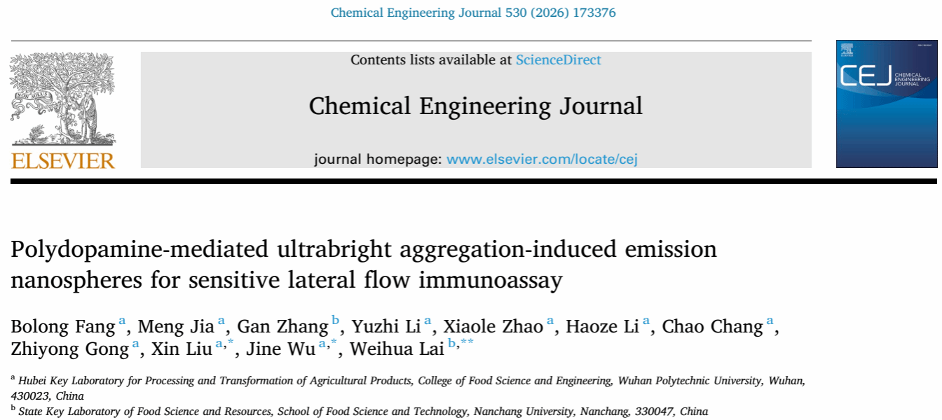 近日,beat365官网中文beats365联合南昌大学食品科学与资源挖掘全国重点实验室在国际期刊Chemical Engineering Journal(IF=13.2)上发表了题为“Polydopamine-mediated ultrabright aggregation-induced emission nanospheres for sensitive lateral flow immunoassay”的研究论文,公司方博龙讲师为论文第一作者,公司柳鑫教授、伍金娥教授和南昌大学赖卫华教授为共同通讯作者。