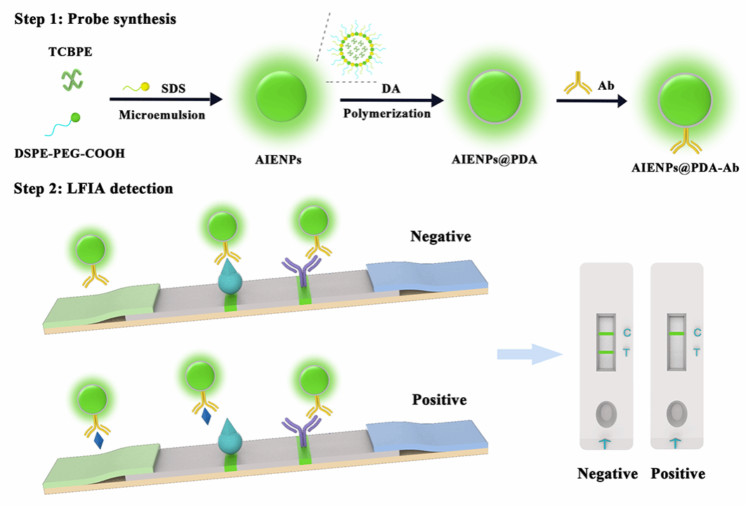 针对传统荧光染料作为检测探针时容易产生聚集诱导淬灭的难题,本研究成功制备了一种基于分子工程的聚集诱导发光纳米球(AIENPs),该材料以TCBPE作为发光核心、以DSPE-PEG-COOH作为表面活性剂。TCBPE分子在聚集状态下限制了其分子内运动,使形成的AIENPs具有较高的量子产率(81.2%)。借助聚多巴胺(PDA)的功能,抗体(Ab)可以有效地通过静电吸附固定在AIENPs表面。此外,通过调节PDA层厚度,AIENPs@PDA保留了90.7%的荧光强度。荧光探针AIENPs@PDA-Ab被应用于免疫层析法中检测鸡肉、猪肉和牛肉中的达氟沙星(DAN)。该方法在15 min实现了一个低的可视临界值(0.25 ng/mL)和检测限(0.01 ng/mL),分别比传统胶体金免疫层析法灵敏10倍和25倍。鉴于该方法的高灵敏度、出色的特异性和优异的回收率,它有希望用于监测各种食品安全污染物。