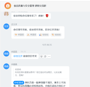 据了解,《食品质量与安全管理》是食品质量与安全专业的专业核心必修课程,此次授课是直播与互动混合式教学的一种尝试,是创新课堂建设的一种方式。通过创新课程的建设,《食品质量与安全管理》线上超星学习资源得到了进一步完善,员工互动突破了环境限制,企业实践经验丰富的管理人员的加入也让课程内容能够对接行业,更接地气。员工普遍反映此类讲座使得学习的内容更加充实,学习效果更加明显,感觉真正学习到了知识。据悉,该课程后续还会邀请更多的行业专家和食品监管部门的人员参与到课程上来,使得员工能够从企业、政府监管者的角度理解课程知识,真正做到将知识转化成解决实际问题能力的教学目标要求。