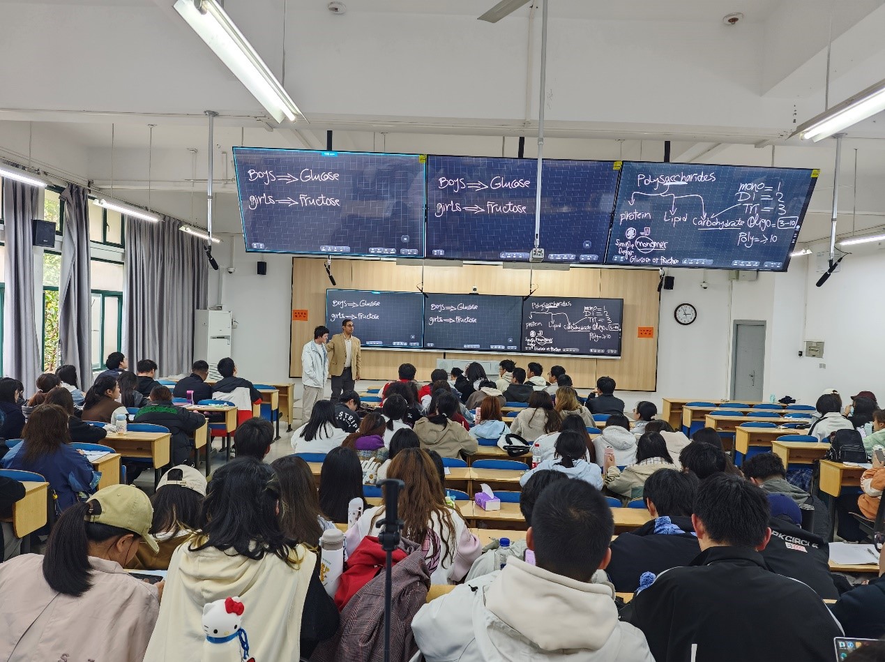 Aly Esmat博士来自英国提赛德大学。在2024.3.25-2024.4.8期间,Aly为中英班2023级本科生进行了“食品科学与营养”课程的讲授。Aly以主题讲授的方式,对食品营养成分、体内代谢、食品加工等相关知识进行了讲授。课堂中,Aly以游戏互动的形式,讲解多糖的组成;以苹果切面和香蕉切面的小实验演示食品氧化,让员工更直观地了解并消化专业知识,课堂氛围活泼。