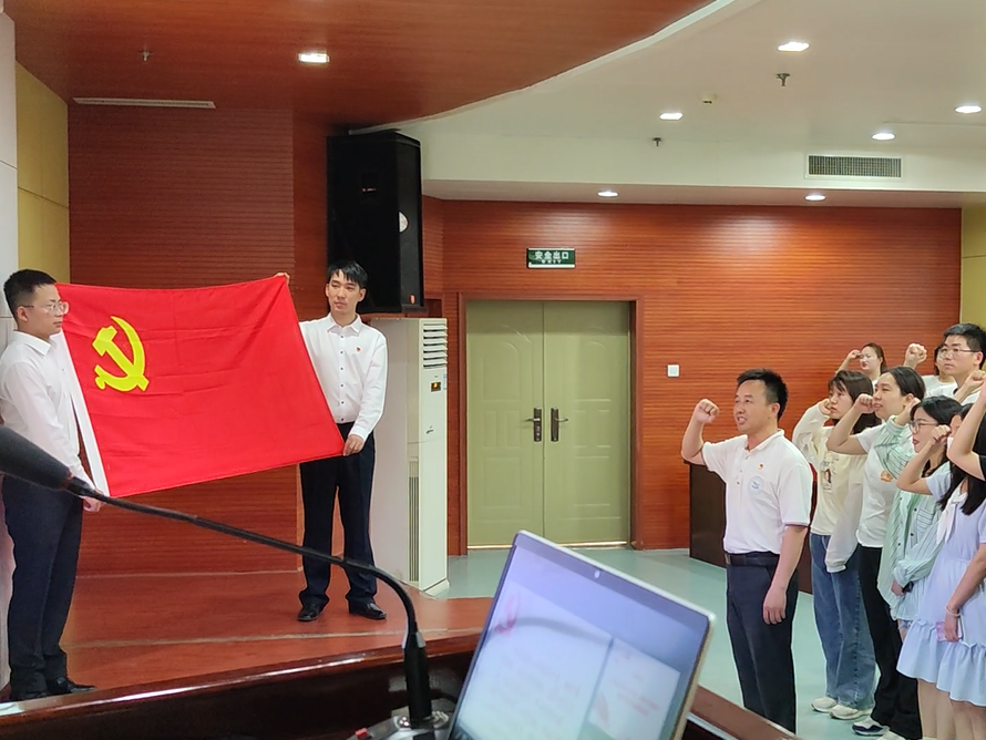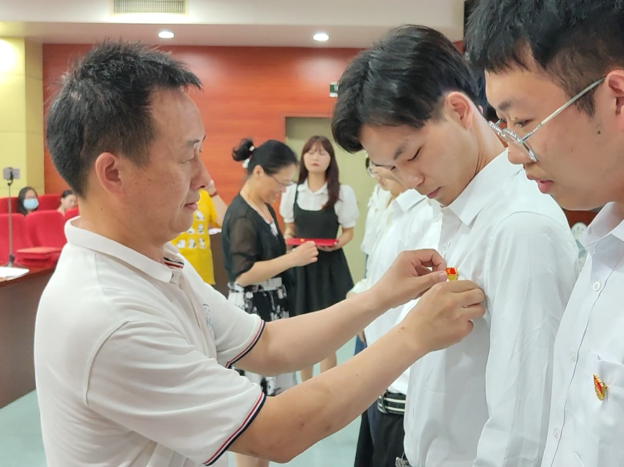 大会在庄严的国歌声中拉开帷幕。公司党委书记王宏光带领新党员入党宣誓,老党员重温入党誓词。王宏光和饶春红分别为新党员代表佩戴党徽,欢迎他们加入党组织的怀抱。