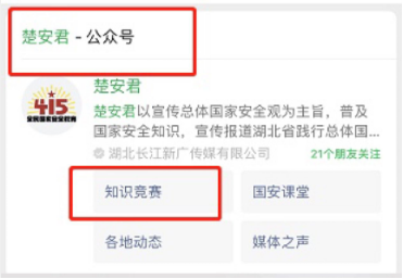 3.完成一次主题竞答。依托省委国安办微信公众号“楚安君”,完成“国家安全,你我共同守护”全省国家安全知识大赛网上竞答。请各班级于4月14日晚21:00前上交答题截图至卢玥(QQ:370770184,电话:18291340710)处,请大家实名参加,勿弄虚作假。
