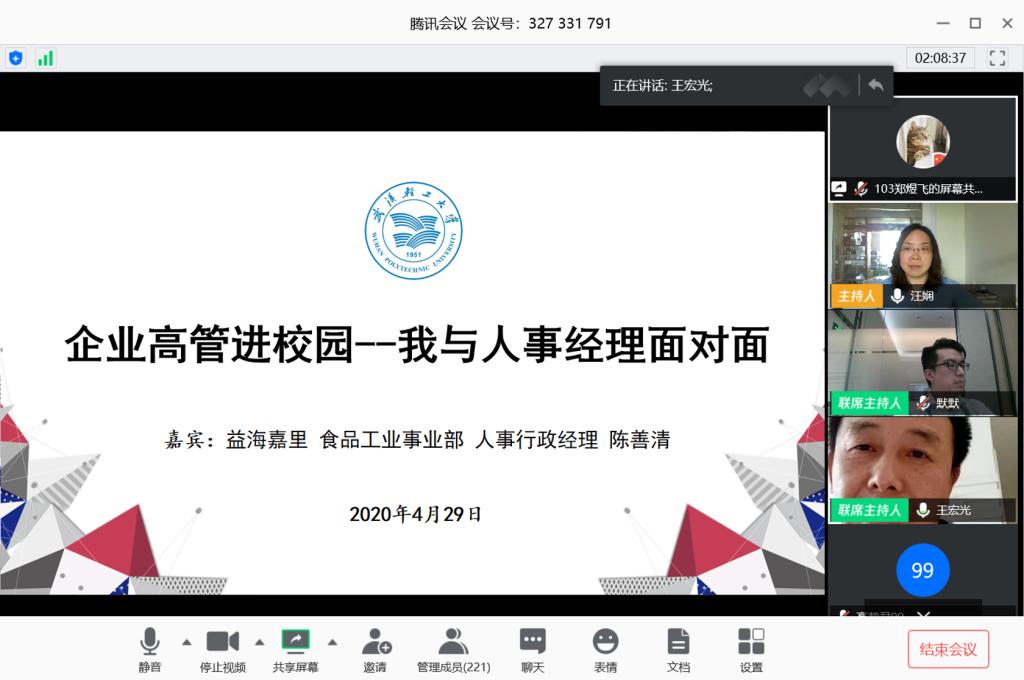 为深入贯彻落实习近平总书记关于做好高校毕业生就业工作的重要批示指示精神,进一步做好疫情防控期间研究生就业指导和职业规划指导工作,4月29日,beats365与益海嘉里食品工业事业部联合举办了“云上”求职交流活动,益海嘉里食品工业事业部人事行政经理陈善清、食品公司党委书记王宏光、研究生辅导员汪娴及全院研究生参加了本次活动。