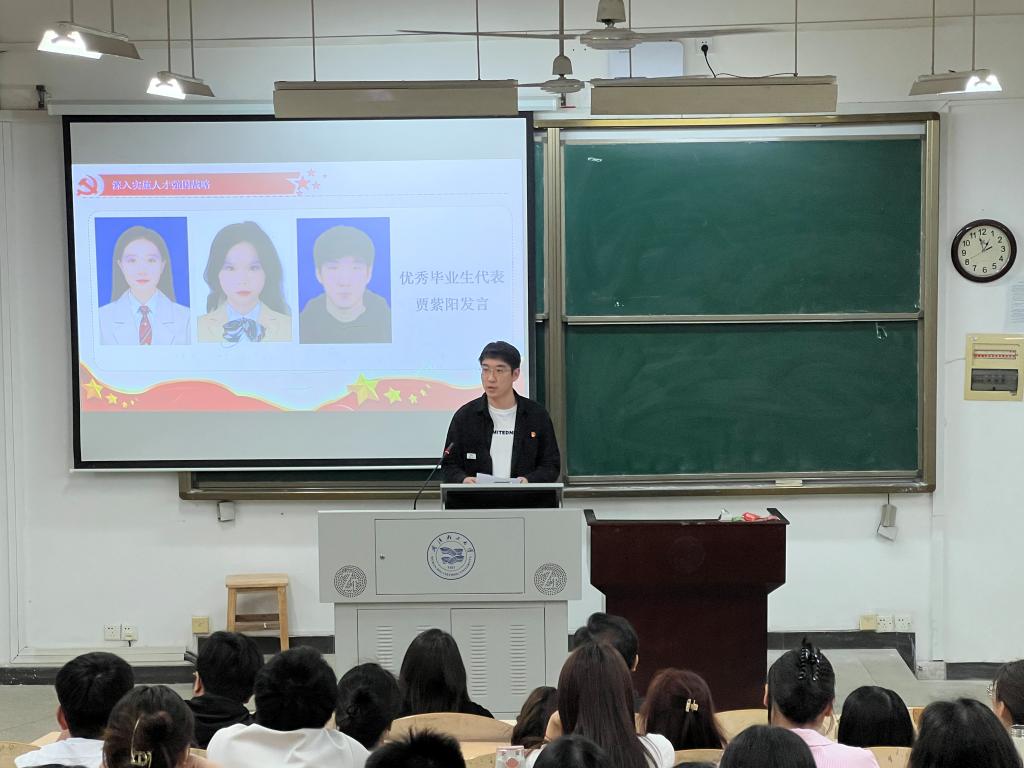 优秀毕业研究生、2020级党员贾紫阳代表全体毕业生党员发言。他表示,未来无论走到哪里,将不负母校重托,牢记“明德、积学、砺志、笃行”的校训,把“小我”融入到祖国和人民的“大我”中去,在奋斗中绘就理想蓝图。他还号召毕业生要文明离校,为学弟学妹留下一个干净卫生的学习环境与生活环境。他衷心感谢公司各级领导与老师们的悉心培养,并祝愿母校的发展更上一层楼。