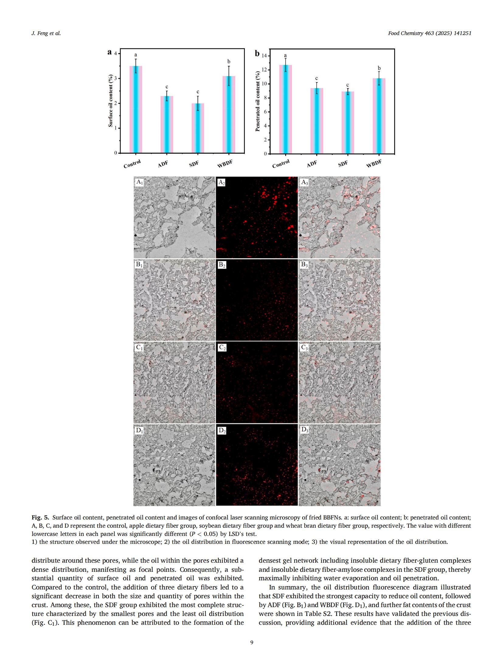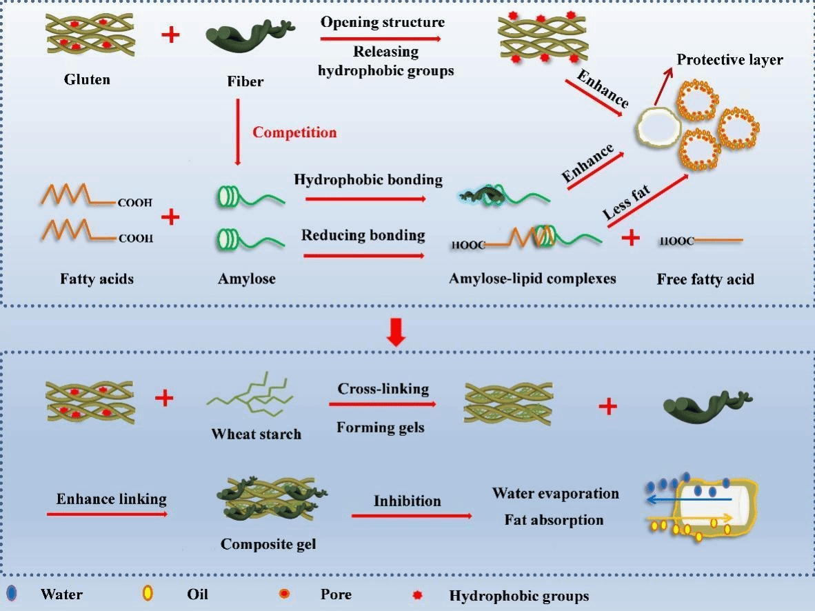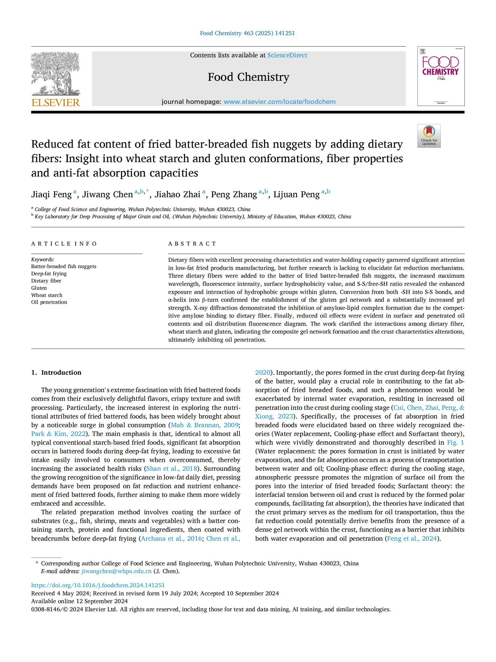 外壳作为油的运输介质,是抑制水分蒸发和油脂渗透关键。本研究提出了一种分子层面的策略,以确定油炸裹浆鱼块(BBFNs)外壳中膳食纤维所引起的麸蛋白和小麦淀粉的构象变化。此外,还评估了复合凝胶的强度和密度,并分析了膳食纤维作为添加的功能性成分抑制油炸BBFNs脂肪吸收的机制。随着膳食纤维的添加,麸蛋白的二级结构构象发生了变化,促进了麸蛋白的变性和凝胶的形成,从而增强了麸蛋白凝胶的持水能力。同时,由于三级结构的构象变化,促进了麸蛋白内部疏水基团的释放,导致了麸蛋白 - 膳食纤维复合凝胶的形成。此外,直链淀粉会与不溶性膳食纤维结合,形成相应的复合凝胶,这一过程不仅减少了外壳内脂肪酸的供应,还竞争性地剥夺了直链淀粉上的疏水位点,减少了直链淀粉 - 脂质复合物的形成及其所携带的吸脂效果。在实际的油炸过程中,倡导使用富含不溶性成分的纤维类型,因为它有助于复合凝胶的形成,并能有效抑制脂肪的吸收。本研究在食品工业中具有重要的应用潜力,不仅为降低油炸食品的脂肪含量提供了理论支持,还为提高食品加工中与膳食纤维相关的食品质量属性提供了参考。