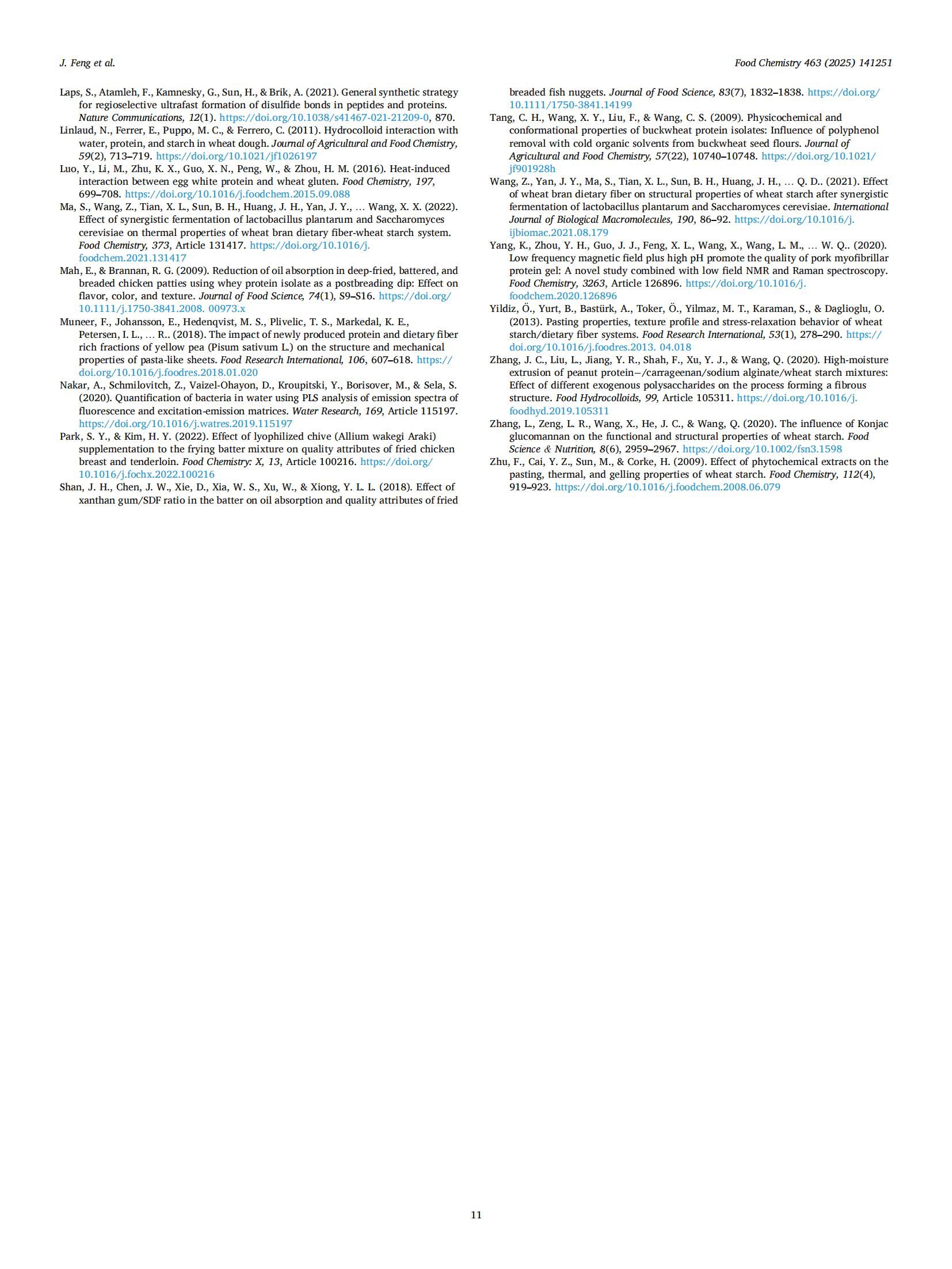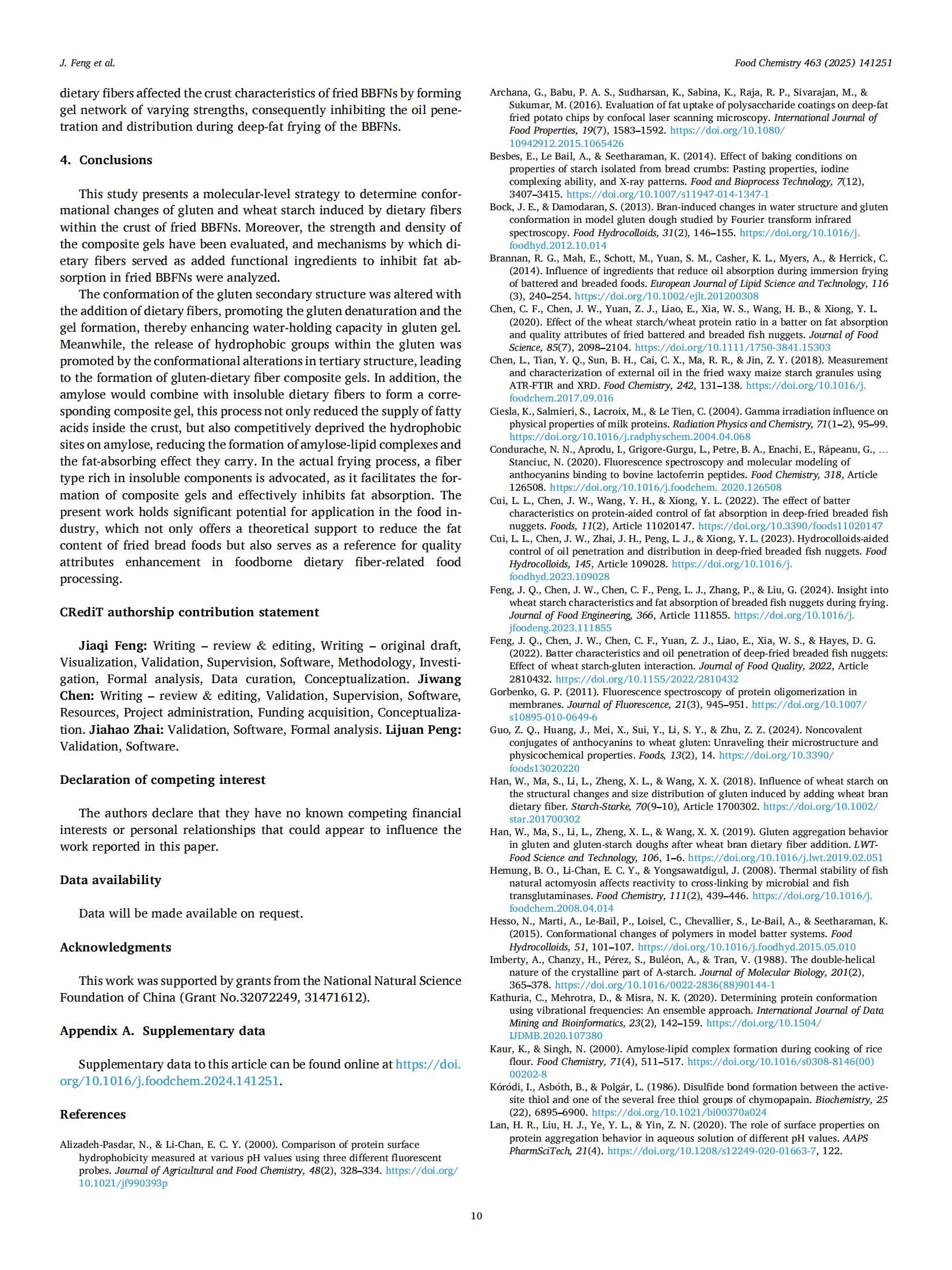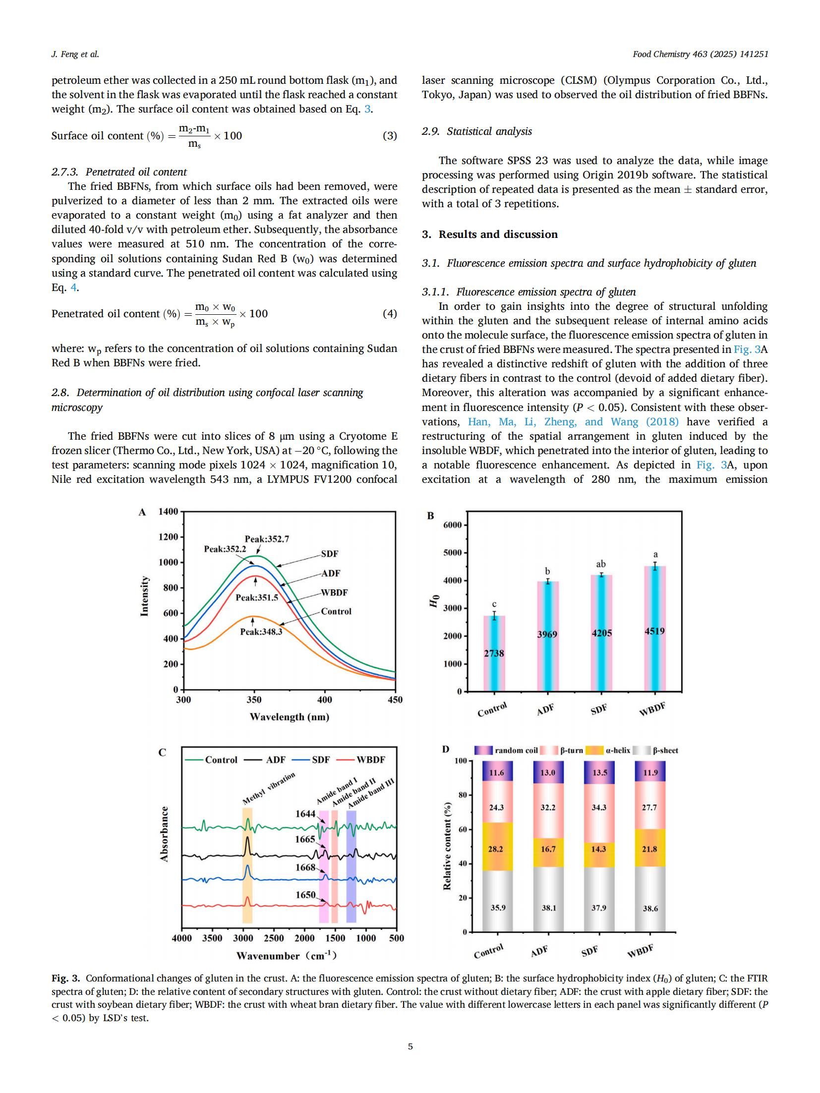 外壳作为油的运输介质,是抑制水分蒸发和油脂渗透关键。本研究提出了一种分子层面的策略,以确定油炸裹浆鱼块(BBFNs)外壳中膳食纤维所引起的麸蛋白和小麦淀粉的构象变化。此外,还评估了复合凝胶的强度和密度,并分析了膳食纤维作为添加的功能性成分抑制油炸BBFNs脂肪吸收的机制。随着膳食纤维的添加,麸蛋白的二级结构构象发生了变化,促进了麸蛋白的变性和凝胶的形成,从而增强了麸蛋白凝胶的持水能力。同时,由于三级结构的构象变化,促进了麸蛋白内部疏水基团的释放,导致了麸蛋白 - 膳食纤维复合凝胶的形成。此外,直链淀粉会与不溶性膳食纤维结合,形成相应的复合凝胶,这一过程不仅减少了外壳内脂肪酸的供应,还竞争性地剥夺了直链淀粉上的疏水位点,减少了直链淀粉 - 脂质复合物的形成及其所携带的吸脂效果。在实际的油炸过程中,倡导使用富含不溶性成分的纤维类型,因为它有助于复合凝胶的形成,并能有效抑制脂肪的吸收。本研究在食品工业中具有重要的应用潜力,不仅为降低油炸食品的脂肪含量提供了理论支持,还为提高食品加工中与膳食纤维相关的食品质量属性提供了参考。