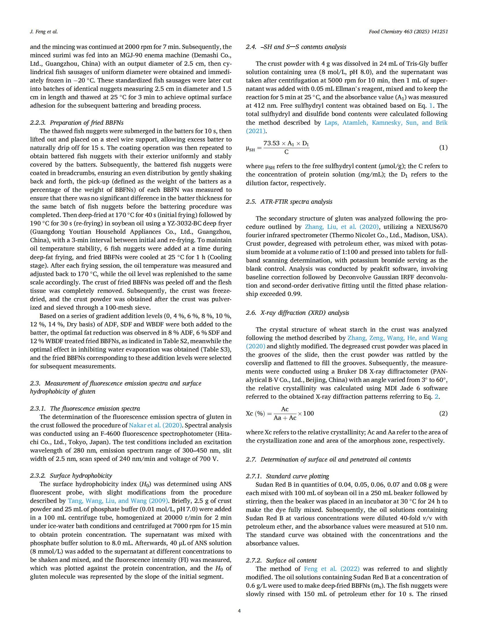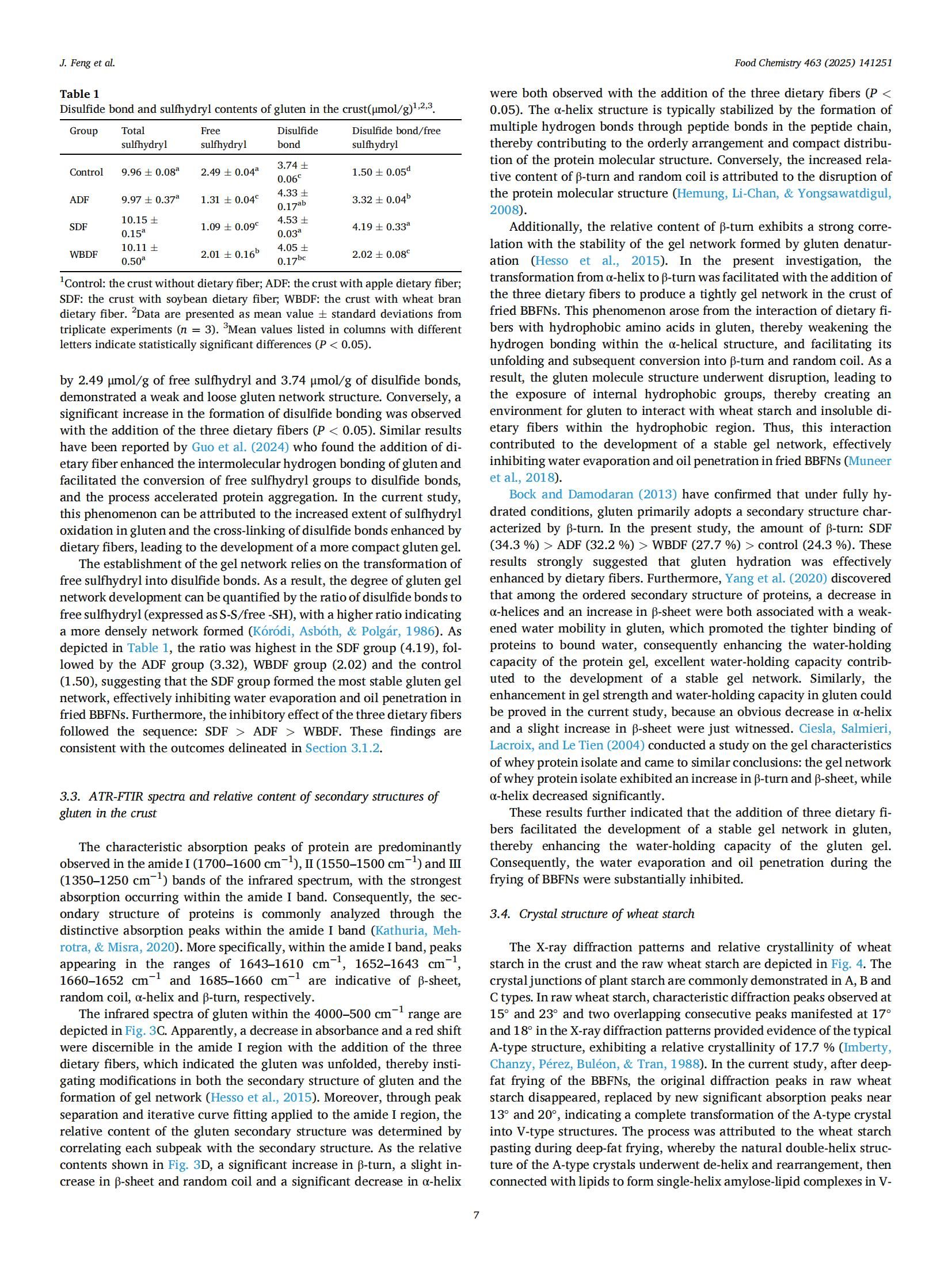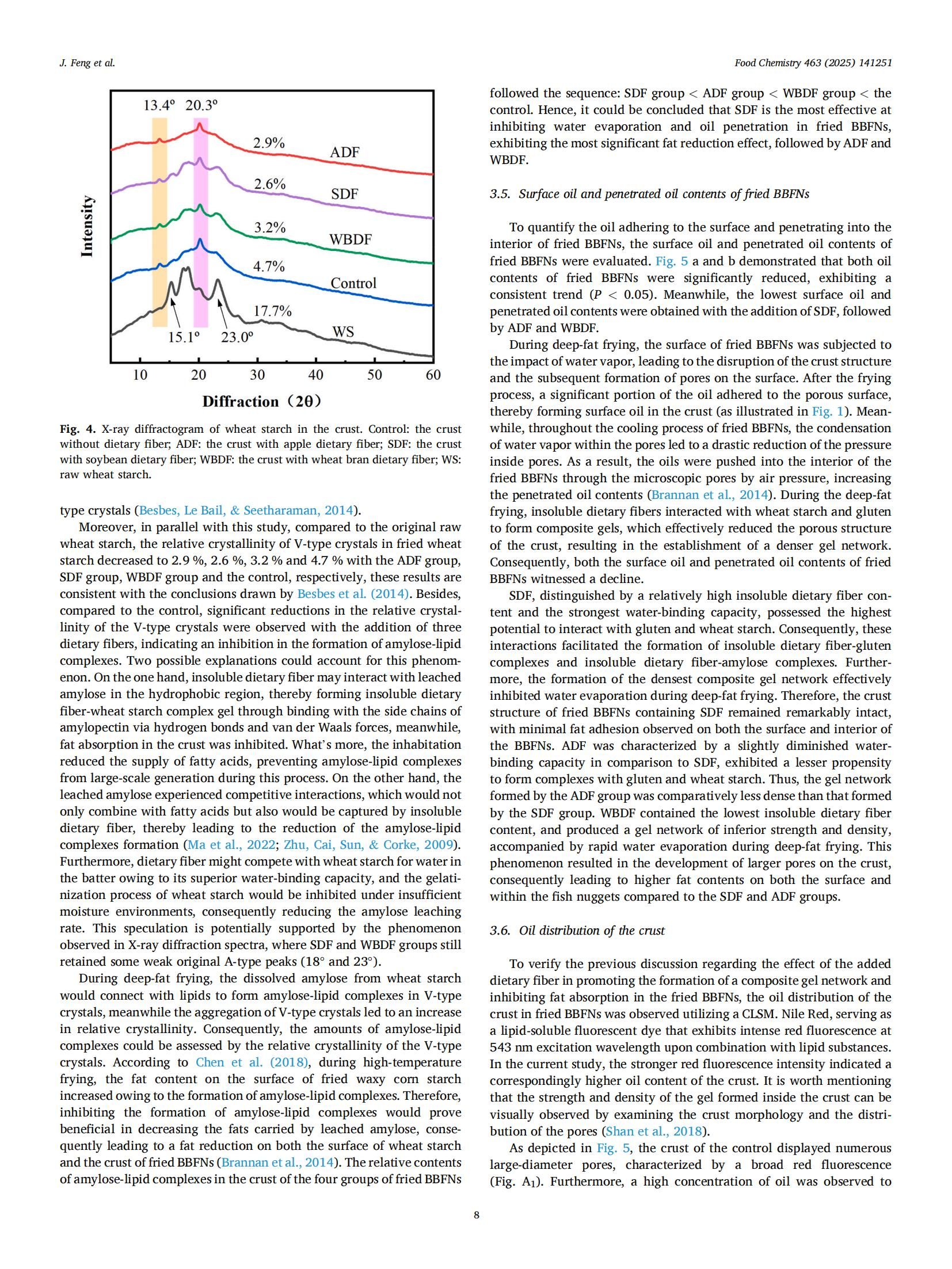 具有优良加工特性和保水能力的膳食纤维在低脂油炸产品制造中受到广泛关注,但缺乏进一步的研究来阐明减脂机制。在裹浆炸面包屑鱼块的面糊中添加了三种膳食纤维,增加的最大波长、荧光强度、表面疏水性值以及二硫键(S-S)/游离巯基(free-SH)比值表明麸蛋白中疏水基团的暴露和相互作用增强。从巯基(-SH)向二硫键(S-S)的转化以及从α-螺旋向β-转角的转变证实了麸蛋白凝胶网络的形成以及凝胶强度的显著增加。X射线衍射表明,由于膳食纤维与直链淀粉竞争性结合,抑制了直链淀粉 - 脂质复合物的形成。最后,在表面和渗透油含量以及油分布荧光图中明显减少了油炸效果。该研究阐明了膳食纤维、小麦淀粉和麸蛋白之间的相互作用,表明了复合凝胶网络的形成以及外壳特性变化,最终抑制了油的渗透。