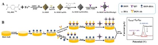 A ratiometric assay was designed to improve the sensitivity and reliability of electrochemical immunosensors for deoxynivalenol (DON) detection. The indicator signal caused by the Fe-based metal–organic framework nanocomposites loaded with gold nanoparticles and the internal reference signal from the [Fe(CN)6]3−/4− in the electrolyte came together at the immunosensor. When immunoreactivity occurred, the indicator signals decreased as the concentration of DON increased, while the internal reference signals increased slightly. The ratio of the indicator signal to the internal reference signal was available for reproducible and sensitive monitoring of DON. The prepared immunosensor showed excellent performance in the range from 0.5 to 5000 pg mL−1, and the detection limit was 0.0166 pg mL−1. The immunosensor achieved satisfactory detection toward DON in spiked and actual samples and has a promising application in the control of DON in grain products.