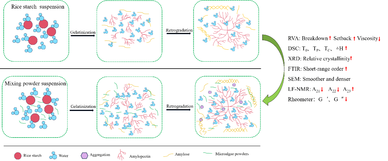 The effect of Chlorella pyrenoidosa (CP) and Spirulina platensis (SP) at concentrations of 0 %–12 % on the properties of rice starch (RS) was investigated. Compared with pure RS, the addition of CP and SP powder decreased the viscosity, increased the gelatinization temperature, and promoted the retrogradation of RS gel. However, when CP was added at 12 % and SP at 8 %, retrogradation inhibition was reduced. At these concentrations, the relative crystallinity of the CP mixture increased by 57.37 %, whereas that of SP increased by 48.13 %. Scanning electron microscopy revealed that the addition of low amount of CP and SP reduced porosity. CP and SP powder facilitated the conversion of bound water to free water and contributed to the weakening of the viscoelasticity of the RS gel. CP powder likely had a more detrimental effect on the short-term storage properties of RS than SP powder. These results provide theoretical support for the development of RS-based products and the innovative utilization of microalgae.