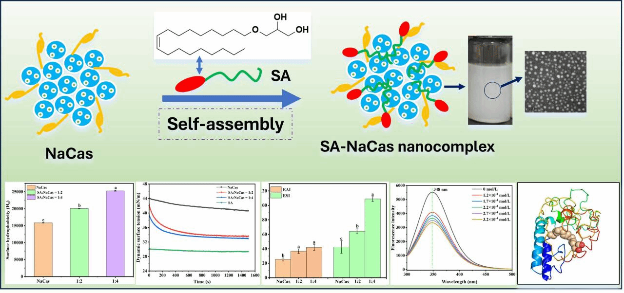 鲨油醇(SA)是一种天然存在的1-O-烷基甘油醚,因其广泛的生物活性而备受关注。为提高其水溶性,研究了其与酪蛋白酸钠(NaCas)的络合作用。结果表明,在1:4的质量比下形成的SA-NaCas复合物为纳米分散体系,与单独的NaCas相比,其表面疏水性增强、动态表面张力降低且乳化指数更优。荧光光谱学阐释了SA和NaCas之间的相互作用是一个自发过程,主要由疏水作用力驱动。在308 K时,结合常数和吉布斯自由能变化分别为1.17×10³ L/mol和-18.09 kJ/mol。分子对接显示,疏水作用和氢键相互作用是将SA结合到NaCas的α-酪蛋白和β-酪蛋白组分的主要作用力。SA-NaCas纳米复合物不仅提高了SA的水溶性,而且可作为一种比NaCas具有更好理化性质的有效的纳米递送系统。