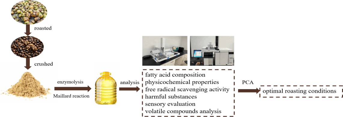 本研究旨在是探索不同条件对FCSO质量和风味的影响。通过理化特性和危害物质分析评估FCSO的品质,通过E-NOSE,HS-SPME/GC-MS和GC-IM分析风味特征。本研究为FCSO的探索提供了理论指导。我们假设不同的焙炒温度和时间可以帮助我们确定保障FCSO质量和风味的最佳制备工艺。