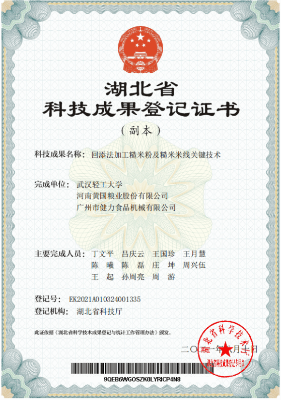 该技术与同类技术相比,生产的糙米粉粒度细且分布均匀,制得的糙米米线口感好,具有明显的竞争优势,由于白米部分采用半干法制粉,与传统湿法磨粉比较节约了大量水耗,技术得到相关企业的认可。