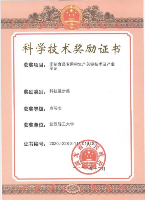 获奖:米制食品专用粉生产关键技术及产业示范,湖北省科技进步三等奖