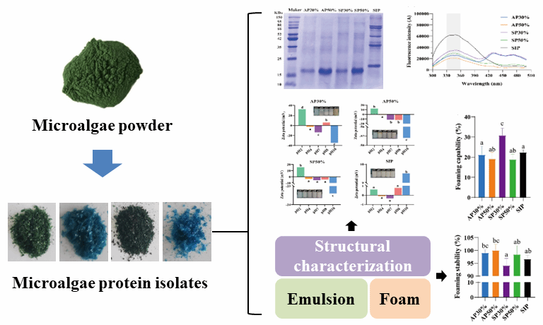 随着人口持续增长,传统食物资源将供不应求,亟需开发可持续的食物资源。微藻是一种潜在的新食物资源,一些微藻(如螺旋藻、莱茵衣藻、原壳藻、小球藻、杜氏藻、裸藻)已被FAO批准作为食品/食品成分。微藻具有提升食品品质的作用,例如提高面包的保水性、改善面团的粘弹性、增加烘焙食品的蓬松度。同时,微藻还具有丰富的营养来价值,研究表明其蛋白质含量高于燕麦、鹰嘴豆、大豆、羽扇豆和蚕豆。然而目前关于微藻蛋白的功能特性(包括起泡性和乳化性)研究较少,尤其是微藻蛋白的分子结构与其功能特性之间的关系尚不明确,这限制了微藻蛋白在食品加工中的进一步开发及应用。本研究探究了两种螺旋藻的可溶性蛋白组分的乳化性和起泡性,并深入分析了螺旋藻蛋白的功能特性与其分子结构和电荷状态之间的关系。
