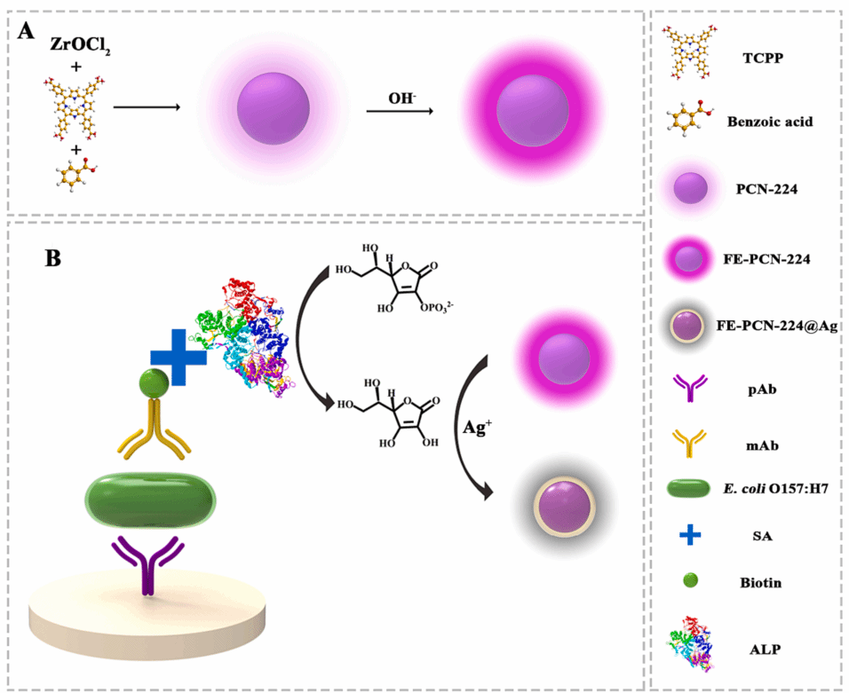 本研究首次合成了一种荧光增强的PCN-224(FE-PCN-224),并解释了荧光增强的机理,它是碱性条件下Zr4+浓度的降低导致了四(4-羧苯基)卟吩(TCPP)电子云密度的部分恢复。因为PCN-224的激发光谱与银纳米粒子(Ag NPs)的吸收光谱存在大面积重叠,所以在FE-PCN-224表面还原Ag+能够导致明显的荧光淬灭效应。这种策略被用于碱性磷酸酶(ALP)引起的FE-PCN-224荧光淬灭型免疫分析法灵敏检测牛奶中的大肠杆菌O157:H7。当存在大肠杆菌O157:H7时,生物素化抗体和链霉亲和素(SA)-ALP能依次固定下来,L-抗坏血酸2-磷酸倍半镁盐水合物(AAP)被催化后产生抗坏血酸(AA)。最终,产生的银层覆盖在FE-PCN-224表面,导致其产生显著的荧光淬灭。本方法的检测限为3.3 × 102 CFU mL−1,比传统的酶联免疫吸附法灵敏29.7倍。本方法为食品安全领域致病菌的灵敏检测提高了一种新思路。