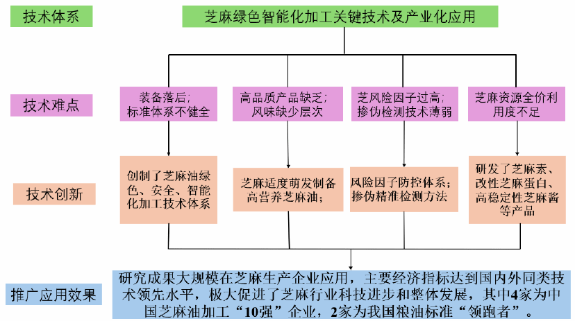 利用率低以及标准体系不健全的共性问题,开发出了芝麻绿色智能化加工关键技术和装备,极大的提升了芝麻油产品的质量,开发了掺伪芝麻油精准检测方法、丰富了芝麻产品的种类以及促进了芝麻标准体系的建设。项目成果在我国11家芝麻加工头部企业实现了产业化应用,取得了显著的社会经济效益。主要创新点如下: