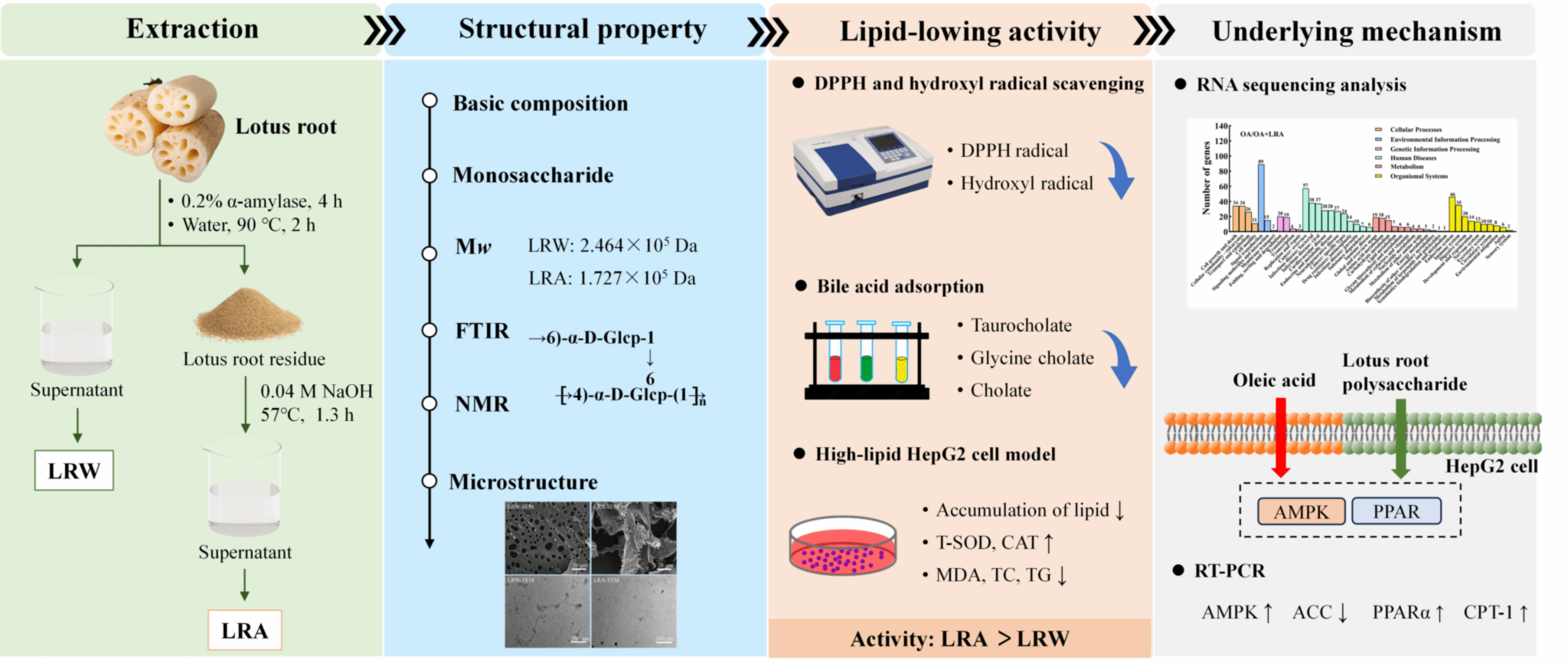 藕是一种广泛流行的具有食用和药用价值的水生蔬菜。公司易阳教授、孙莹老师等人分别用水提法和碱提法提取的两种藕多糖LRW和LRA,并对其结构和降脂活性进行了系统研究。结果表明,碱提法可显著提高莲藕多糖的得率。基本组成和结构表征表明,LRW和LRA的总糖含量分别为96.83 %和73.66 %,分子量分别为2.464 × 105 Da和1.727 × 105 Da。LRW和LRA具有相似的结构,主要由 → 4)-α-D-glcp-(1 → 组成,在C-6位点有分支。LRW和LRA均能有效清除DPPH和羟基自由基,对胆酸盐具有较强的吸附能力,且呈浓度依赖性。在HepG2细胞中,LRW和LRA抑制油酸诱导的脂滴积聚,提高T-SOD和CAT活性,同时降低MDA、TC和TG水平,表现出良好的降脂活性。相比之下,LRA的降脂效果优于LRW。此外,基因测序和RT-PCR结果显示,AMPK、ACC、PPARα和CPT-1是LRA发挥降脂作用所必需的。本研究为莲藕多糖的提取及降脂应用提供了理论依据。