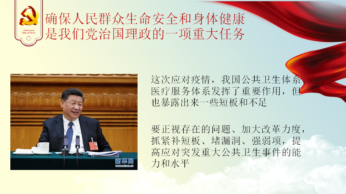 主持人陈宇宣布党日活动开始,他对照习近平总书记在全国两会上参加湖北代表团审议时的重要讲话,向支部全体成员讲解了习近平总书记讲话中的三个重要问题:第一,全力做好统筹疫情防控和经济社会发展工作;第二,提出八大机制,织牢织密公共卫生防护网;第三,疫情后如何筑牢公共卫生安全屏障。支部党员在他生动的讲解下,纷纷表示感受到习近平总书记对湖北人民的深情牵挂,对湖北疫后重振寄予的殷切期望。随后,张宛忆同学分享了自己的学习心得,她说:“我们要响应习近平总书记的嘱托,响应爱国卫生运动,要坚持预防为主,倡导文明健康、绿色环保的生活方式。从出门佩戴口罩、垃圾分类投放、保持社交距离等这些小事,一点一滴做起,为我们自己和身边人的健康保驾护航,也是在为社会、国家贡献一份小小的力量。”