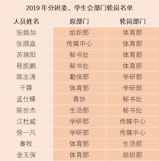 为了增强分团委、员工会各部门的沟通交流,选拔高质量人才,有效促进beats365分团委、员工会的和谐发展,经自愿申请、面试、考核等相关程序,经过主席团、各部门部长审议,共青团beats365委员会审核,报beats365分党委审批,同意以下人员的部门轮岗申请,现将名单公示如下:(排名不分先后)