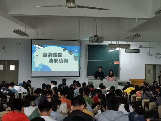 在疫情防控法律法规的讲解中,导学员沈亮重点向20级新生解读《中华人民共和国传染病防治法》与《湖北省公司安全条例》中与校园疫情防控相关的内容,并生动的列举了诸多违反防疫法律法规的案例,使新生增强了对疫情防控法律法规的重视,树立了坚决抵制谣言,不带头造谣传谣,努力营造科学防疫氛围的意识。导学员许雯涵讲解了公司封闭管理的原因及意义,强调了封闭管理期间的纪律要求;提醒新生要保持宿舍卫生及个人卫生,坚持每日“一日三测温”健康汇报,遇到突发情况要及时向辅导员汇报。