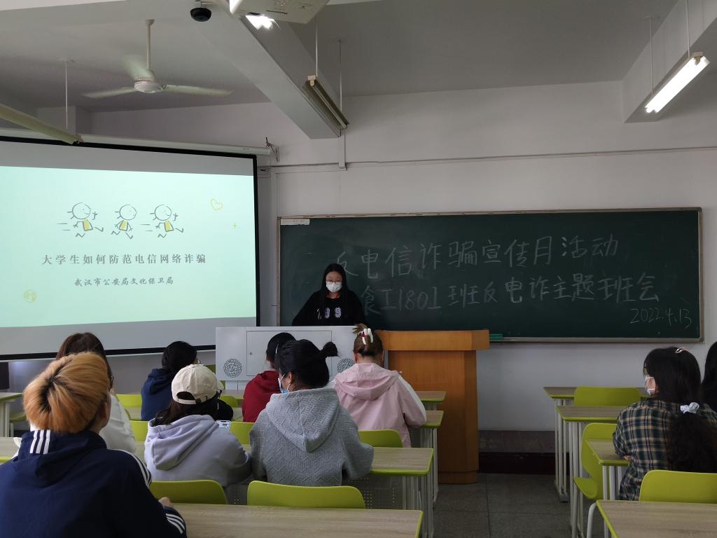 通报诈骗警情后,各班在班会上还集中学习了武汉市公安局文化保卫局制作的《老员工如何防范电信网络诈骗》、《校园防骗微课堂》PPT,食工1808班班长余健结合PPT对同学们再三叮嘱:“对于网上中奖、投资、赌博平台、聊天工具诈骗的常见网络诈骗要提高警惕,做到不贪图便宜,拒绝私下交易;现在新型的诈骗方式频出,遇到诈骗事件要做到不慌张、冷静处理,第一时间报警并告知辅导员。”