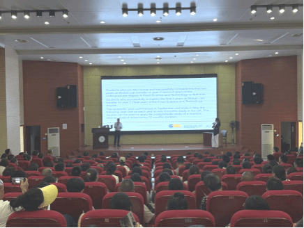 随后,王梦思老师详细解析了双学位交换项目的具体实施方案、毕业出路以及往届优秀学子的成功案例。她表示,通过这一项目,员工不仅能获得中英两国高校的双学位认证,还能在跨文化环境中锻炼自我,为未来申请世界顶级学府深造或步入职场奠定坚实的基础。交换生代表胡朗润以亲身经历分享了自己的留学历程。他从员工视角讲述了对项目的理解与憧憬,用鲜活的个人体验让新生和家长们更直观地感受到项目的魅力。