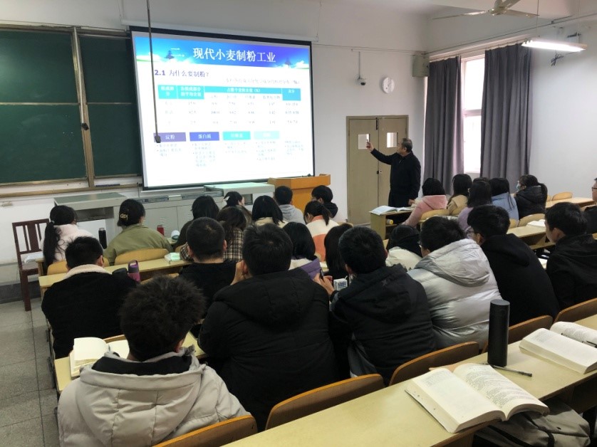 新学期伊始,在该课程的第一堂课上,周坚教授向同学们详细讲授了制粉专业的历史、现状和发展趋势,提出了“为什么要制粉”和“要制什么样的粉”等问题并做出了专业的解答,同时给同学们引入了“适度加工”和“全麦粉”的概念,让同学们了解制粉行业的最新动态和亟待解决的问题,激发同学们的学习热情。