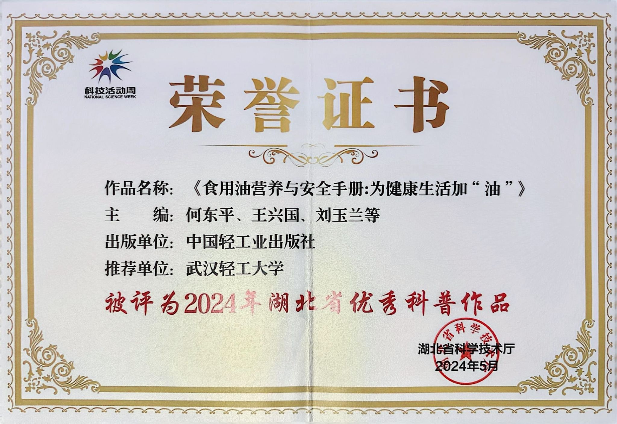 何东平主编《食用油营养与安全手册:为健康生活加“油”》被评为2024年湖北省优秀科普作品