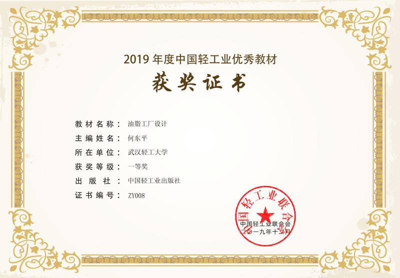 何东平主编《油脂工厂设计》获第三届中国轻工业优秀教材一等奖