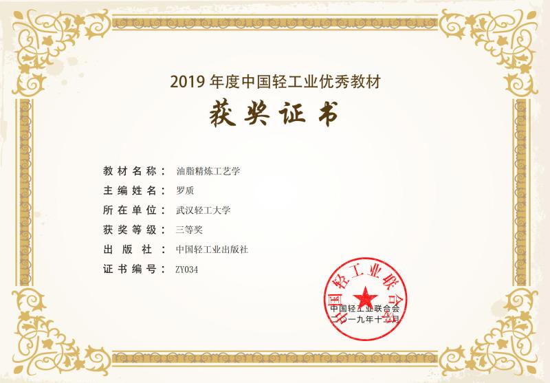 罗质主编《油脂精炼工艺学》获第三届中国轻工业优秀教材奖三等奖